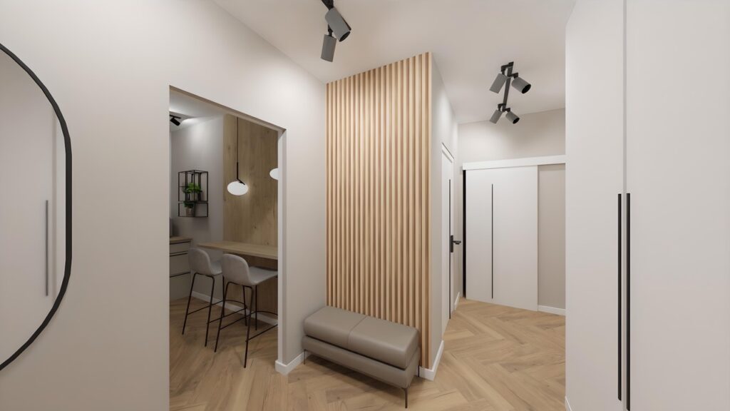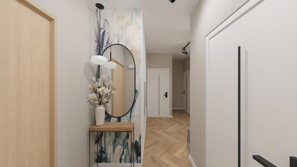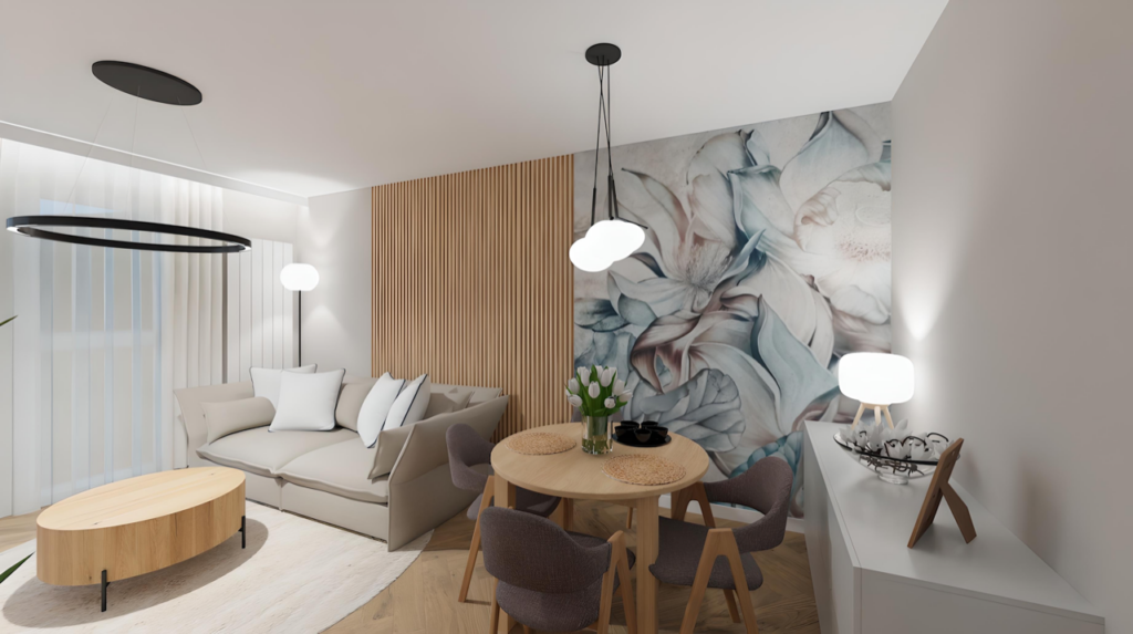 Na ścianach pojawiły się dekoracyjne lamele oraz elementy drewna, które nadają wnętrzu elegancji i naturalnego charakteru. W salonie centralnym punktem stała się efektowna fototapeta, która subtelnie podkreśla nowoczesny styl mieszkania, dodając mu unikalnego wyrazu.